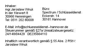 Unser Leistungen:Schlüsselnotdienst, Alarmanlagen, Videoüberwachung und Absicherungen aller Art, Einbruchschutz, Schließanlagen“Diese Website benutzt Google Analytics, einen Webanalysedienst der Google Inc. (Google) Google Analytics verwendet sog. Cookies, Textdateien, die auf Ihrem Computer gespeichert werden und die eine Analyse der Benutzung der Website durch Sie ermöglicht. Die durch den Cookie erzeugten Informationen über Ihre Benutzung dieser Website (einschließlich Ihrer IP-Adresse) wird an einen Server von Google in den USA übertragen und dort gespeichert. Google wird diese Informationen benutzen, um Ihre Nutzung der Website auszuwerten, um Reports über die Websiteaktivitäten für die Websitebetreiber zusammenzustellen und um weitere mit der Websitenutzung und der Internetnutzung verbundene Dienstleistungen zu erbringen. Auch wird Google diese Informationen gegebenenfalls an Dritte übertragen, sofern dies gesetzlich vorgeschrieben oder soweit Dritte diese Daten im Auftrag von Google verarbeiten. Google wird in keinem Fall Ihre IP-Adresse mit anderen Daten der Google Inc. in Verbindung bringen. Sie können die Installation der Cookies durch eine entsprechende Einstellung Ihrer Browser Software verhindern; wir weisen Sie jedoch darauf hin, dass Sie in diesem Fall gegebenenfalls nicht sämtliche Funktionen dieser Website voll umfänglich nutzen können. Durch die Nutzung dieser Website erklären Sie sich mit der Bearbeitung der über Sie erhobenen Daten durch Google in der zuvor beschriebenen Art und Weise und zu dem zuvor benannten Zweck einverstanden.” Die jeweiligen Markennamen sind urheberrechtlich geschützt und Eigentum des Rechteinhabers, sie werden hier nur verwendet weil sie Bestandteil des Produktes sind und die Qualität kennzeichnen.